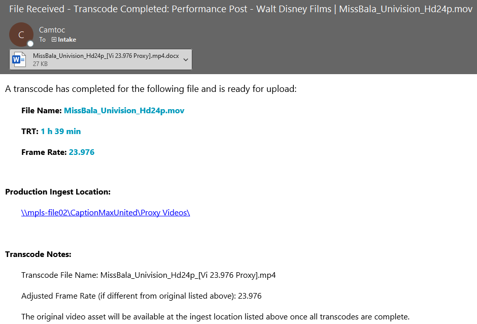 Below is an example of a File Received - Transcode Required Intake notification. After that initial portion of the subject line, which tells you what's happening with the file, it lists the folder the file was uploaded to. In this case it's "Performance Post - Walt Disney Films". If it says "Manual" in that spot that means TechOps downloaded the file from a link and manually dropped it in the watch folder, so you can check the Download distro for more details. Then finally the subject line lists the file name, in this case "MissBala_Univision_Hd24p.mov". The email's attachment is the File Name doc which can be uploaded to Ooona, and it contains a readout from MediaInfo with the original video's specs.