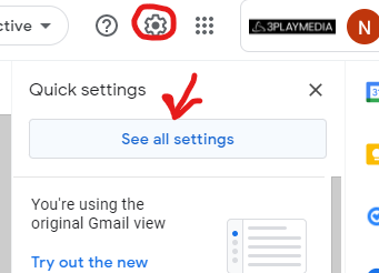 In that tab go to : https://mail.google.com/ Sign in with your 3play account. Click on the gear in the top right corner. Click on "See All Settings"