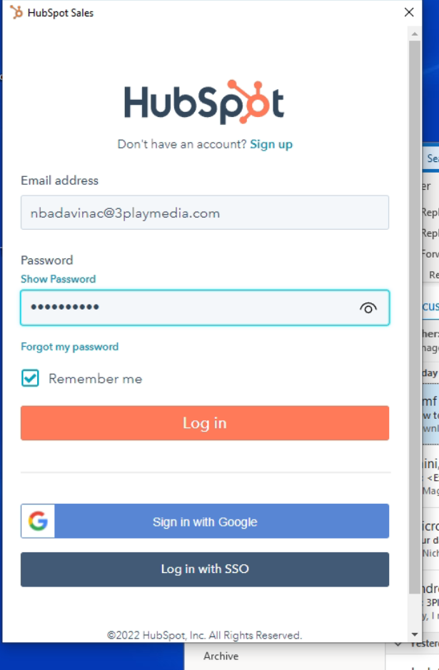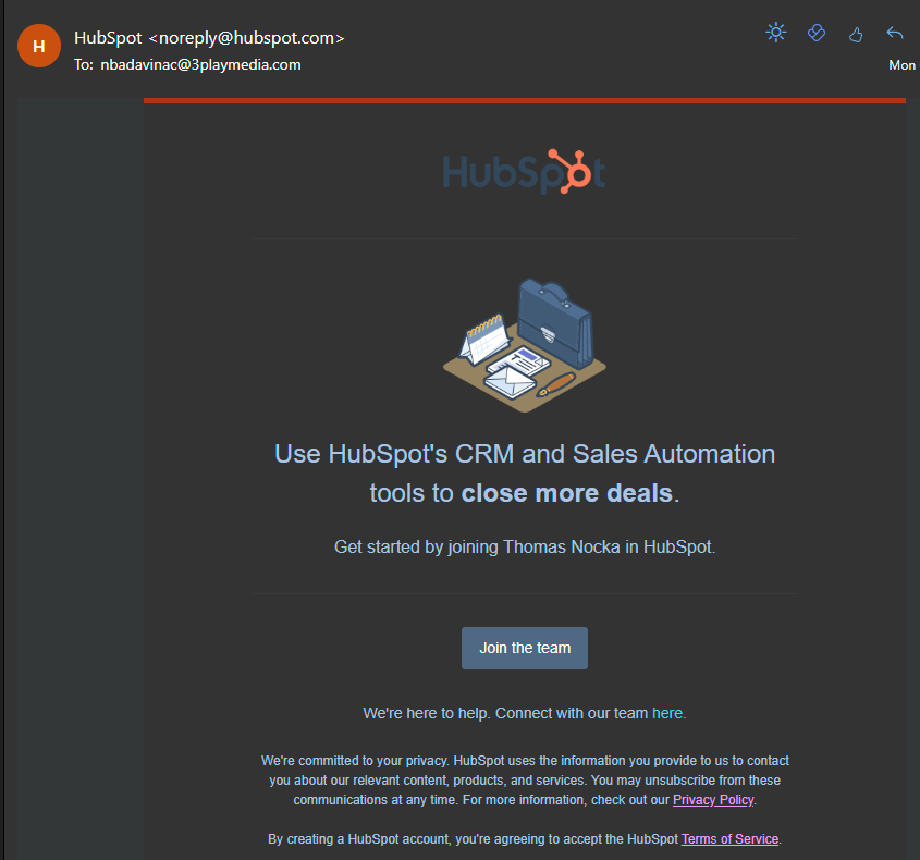You should have received an email from noreply@hubspot.com. This email would have went to your @3playmedia.com email and should have been forwarded to your outlook mailbox. If it was not forwarded please make sure you have your email forward set up the directions are at the bottom of the email setup document: https://captionmax.cayzu.com/KnowledgeBase/Details/?id=63-Google-Calendar-Sync-and-Email-Forward